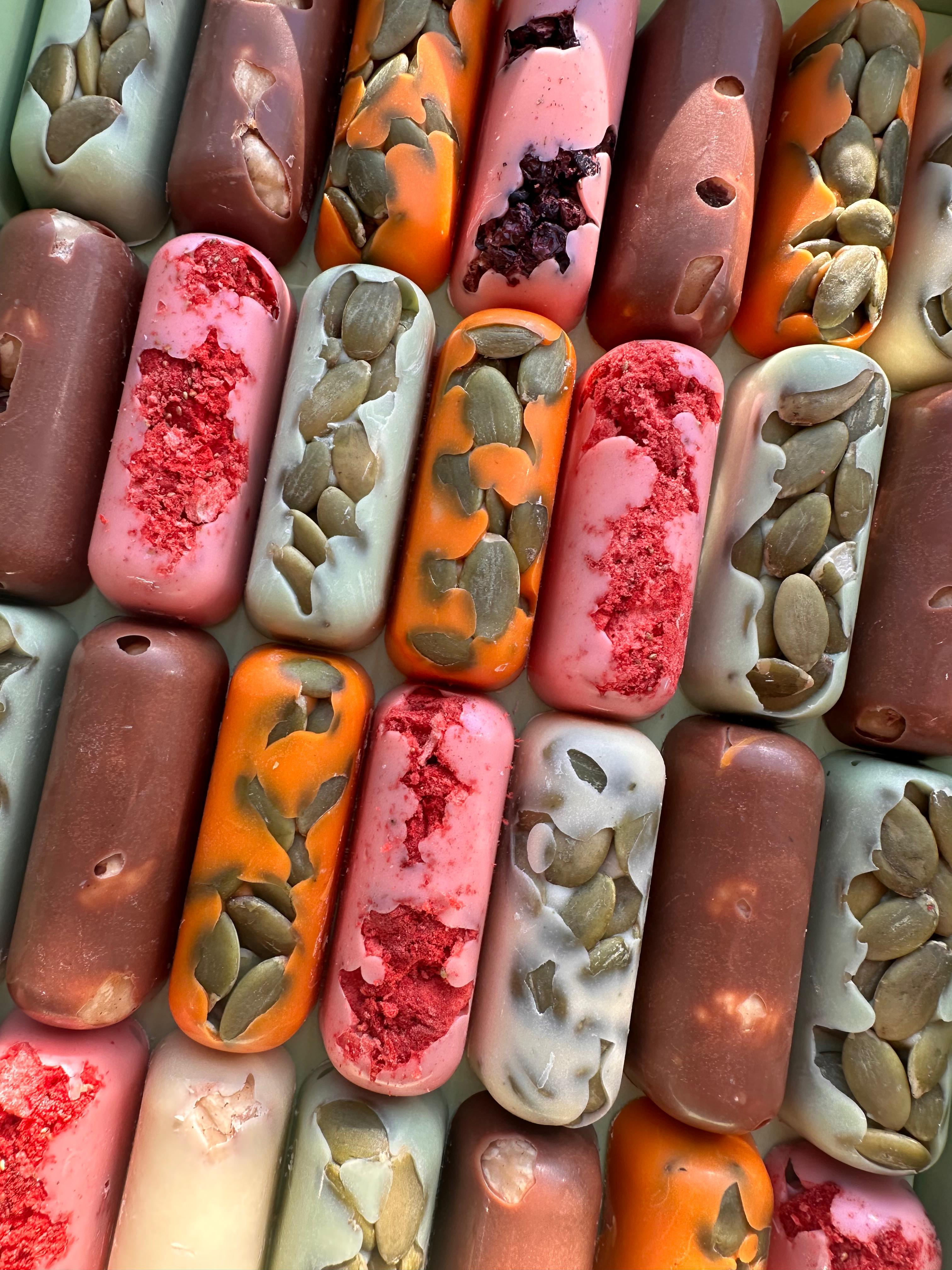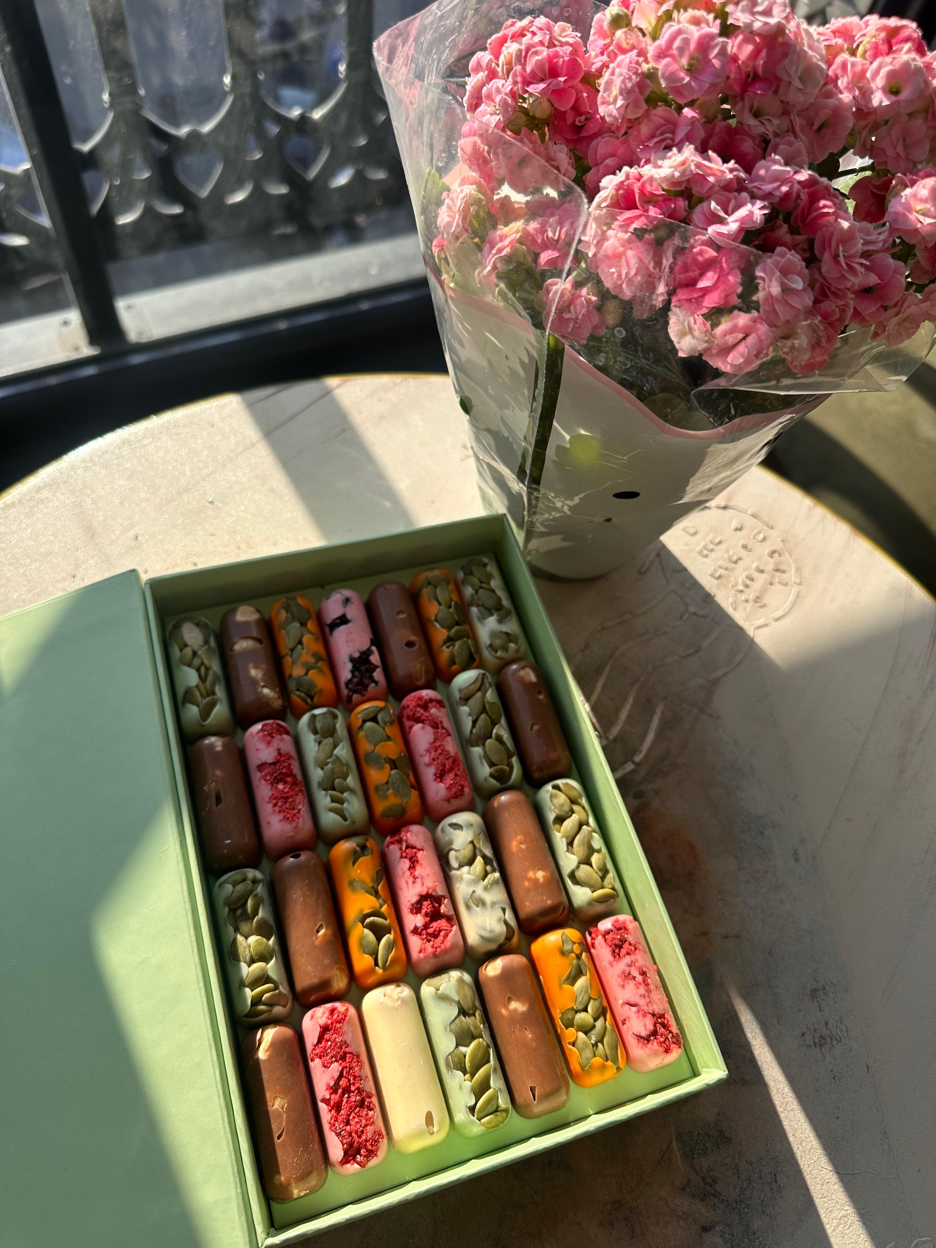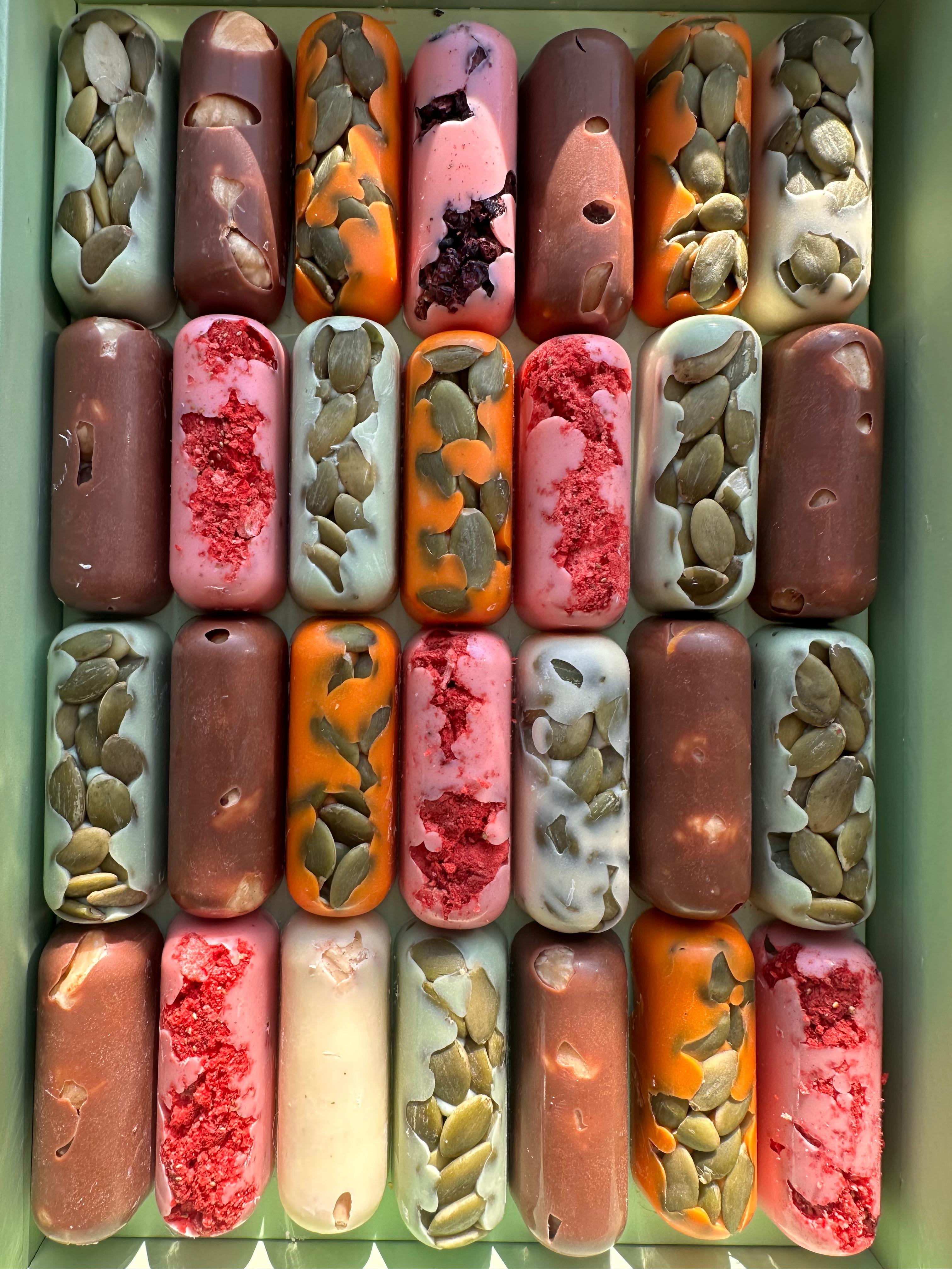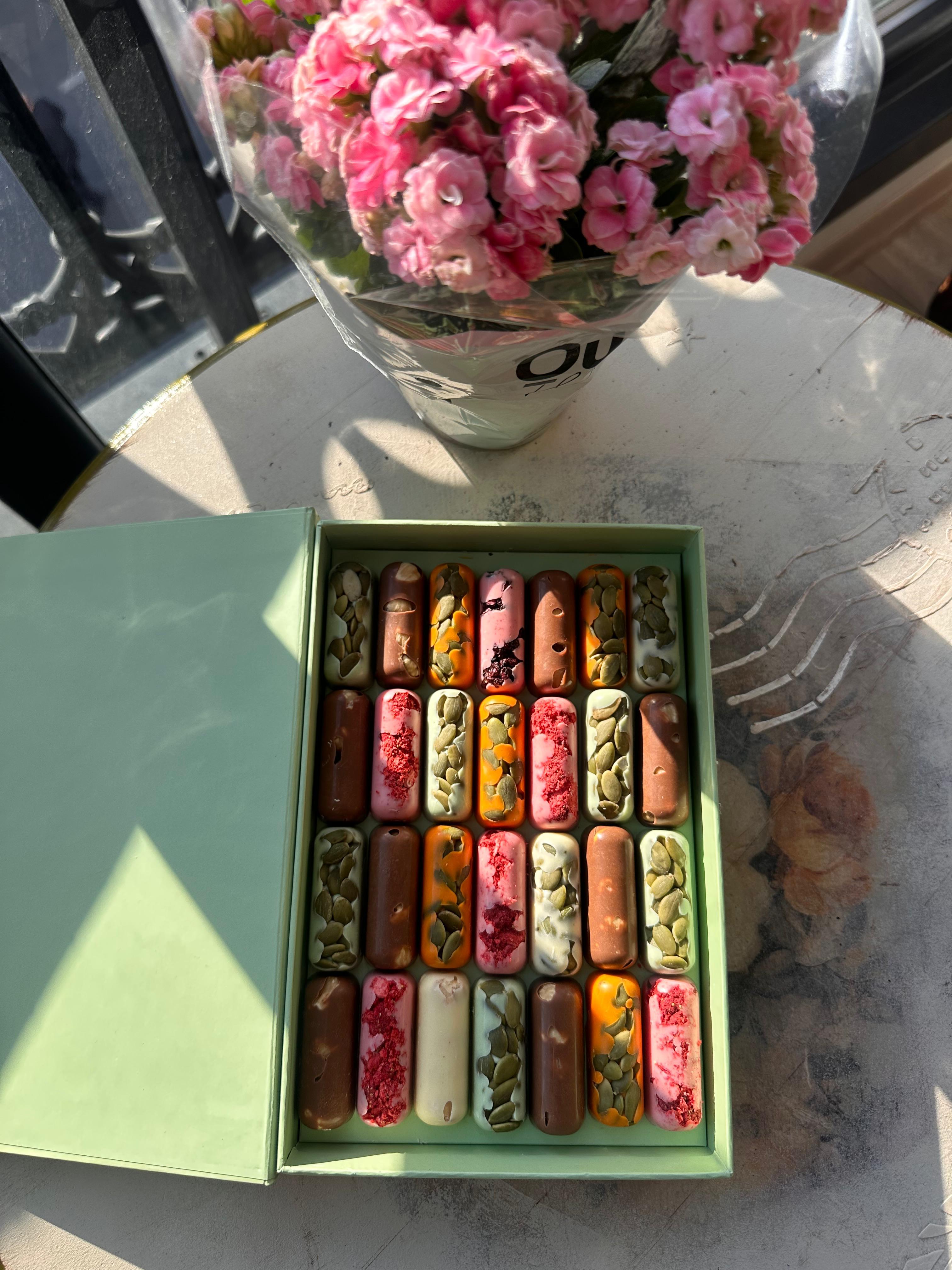 - İçeriği: Yüksek kaliteli süt çikolata, fındık, ceviz, badem, kuru meyveler (şeftali, kayısı, üzüm) ve doğal tatlandırıcılar.